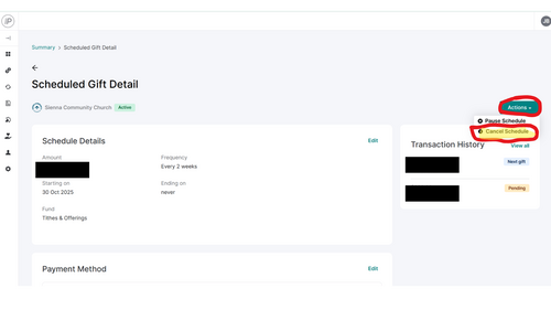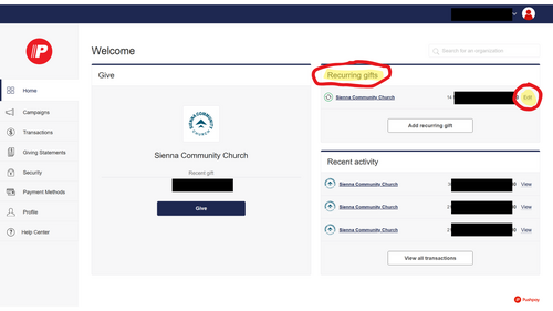 1. After signing into Pushpay, look at the Recurring Gifts section and click "EDIT' on the recurring gift to cancel